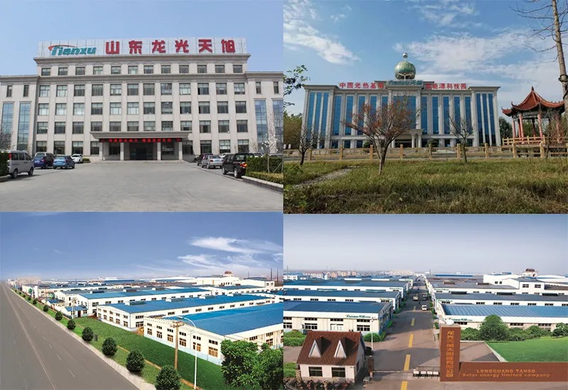 Shandong Longguang Tianxu Solar Energy Co., Ltd., established in 2002 with a registered capital of 100 million yuan, is located in Zhucheng City, known as the "Hometown of Emperor Shun" and the "Dragon City." This company is a high-tech enterprise engaged in the research, development, production, and sales of high borosilicate special glass and new energy products such as solar thermal, photovoltaic, and air source heat pumps, possessing independent import and export rights. Its main products include: high borosilicate solar glass tubes, solar water heaters, medium- and high-temperature collector tubes, all-glass vacuum collector tubes, waterless antifreeze heat pipes, solar thermal engineering projects, and air source heat pumps. The company has successively won numerous honors such as "Shandong Famous Brand," "Shandong Famous Trademark," "National Leading Brand in Solar Thermal Industry Quality," "Contract-Abiding and Creditworthy Enterprise," and "Shandong Excellent Brand." It is a national high-tech enterprise with two provincial and municipal-level science and technology research and development platforms. It is a member unit of the National Solar Energy Standardization Technical Committee. As a leading backbone enterprise in the industry, Tianxu Company has participated as a major unit in the drafting of several national and industry standards, including "Technical Requirements for All-Glass Vacuum Collector Tubes" and "Technical Requirements for Flat-Plate Solar Thermal Collectors."